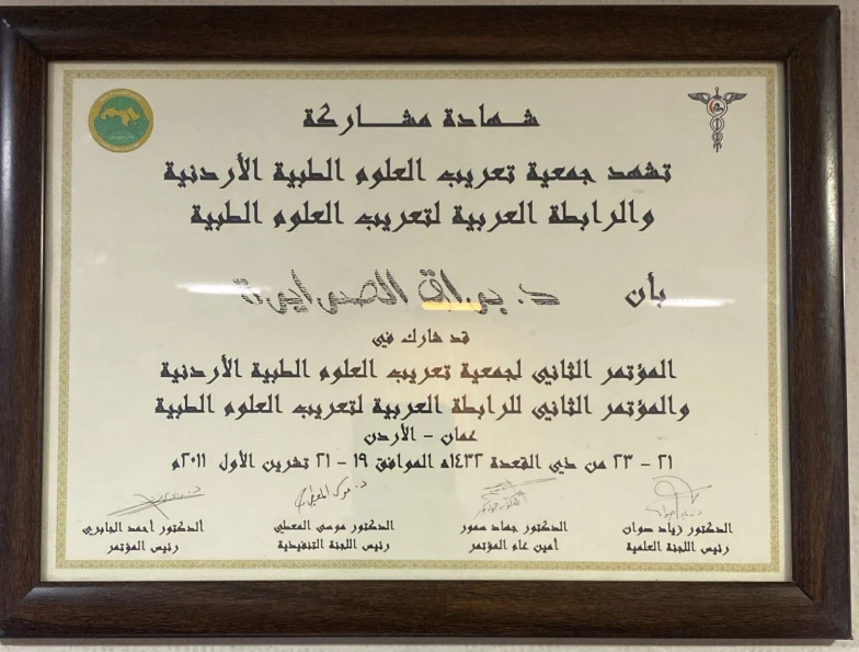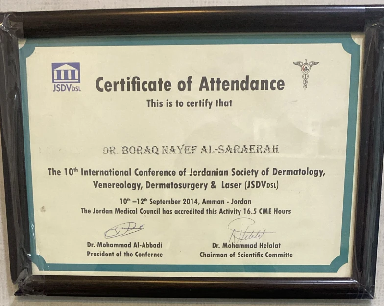- حاصلة على البورد الأردني في الأمراض الجلدية والتناسلية عام 2014.