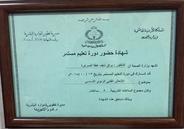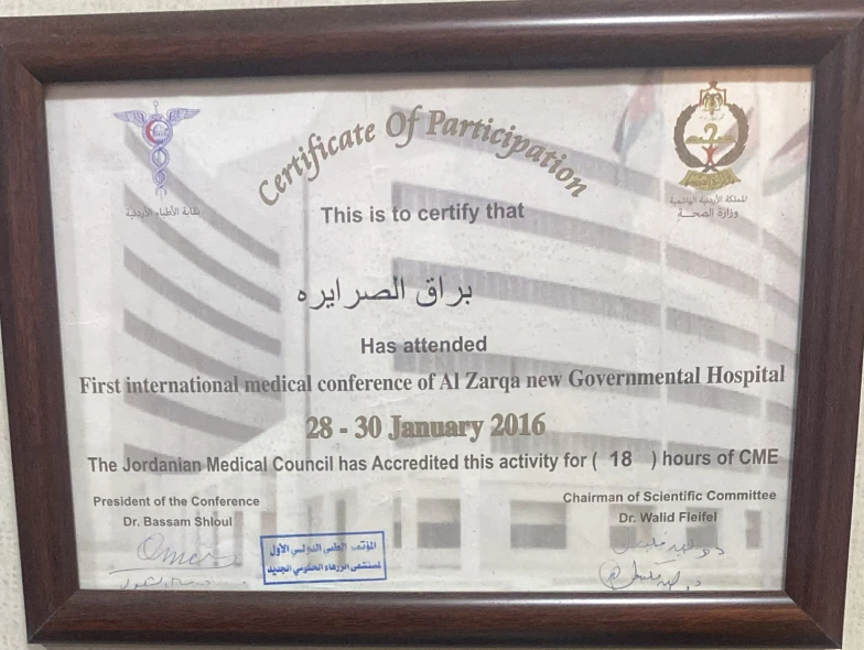 حاصله على الزماله السعوديه SCFHS - تعمل حاليا الدكتوره براق الصرايرة في مستشفى سليمان الحبيب في السعودية جده