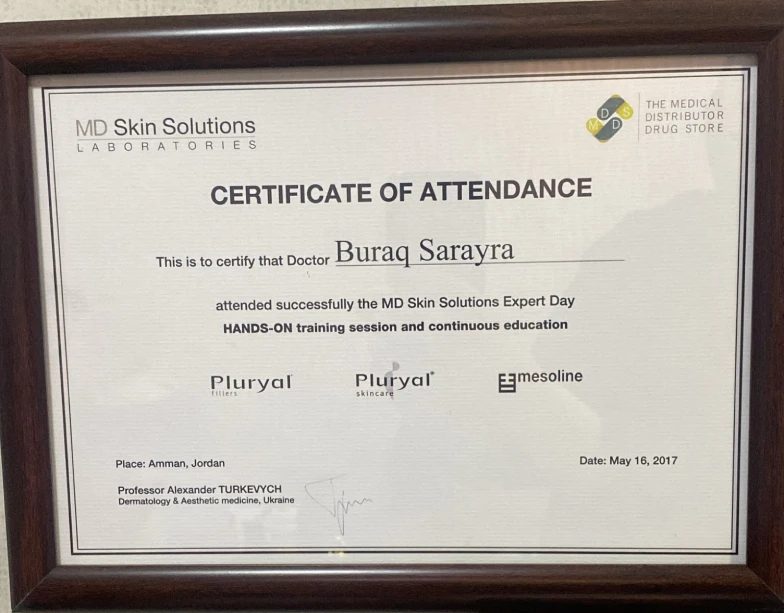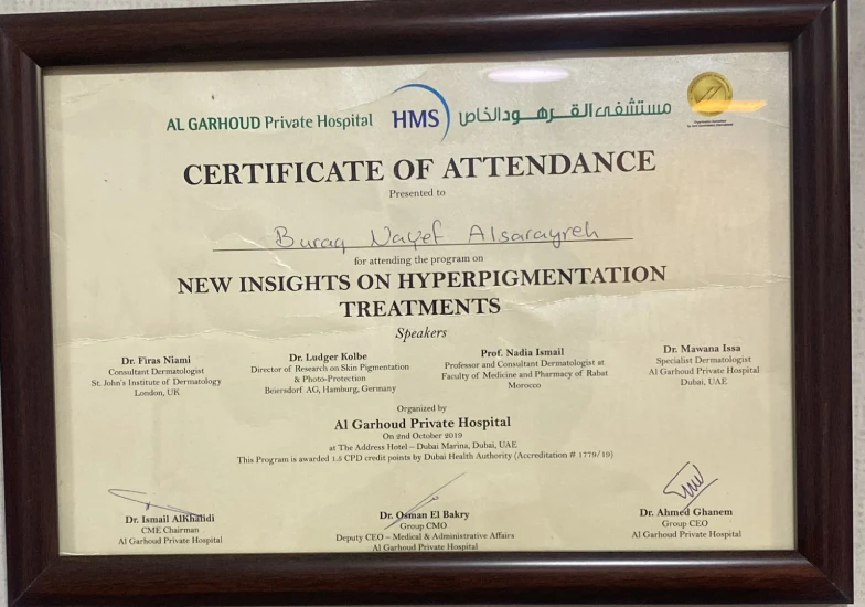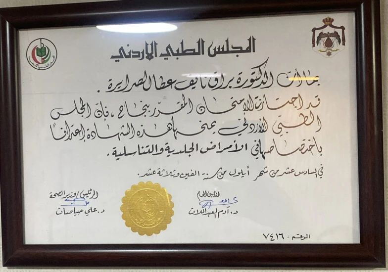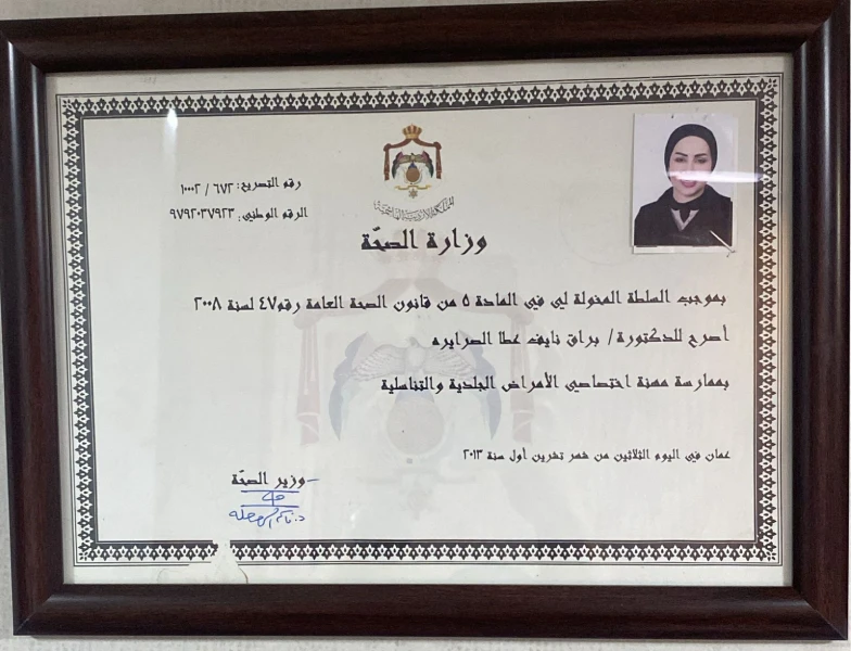 - أنهت برنامج الاختصاص في الأمراض الجلدية في الخدمات الطبية الملكية ووزارة الصحة الأردنية.